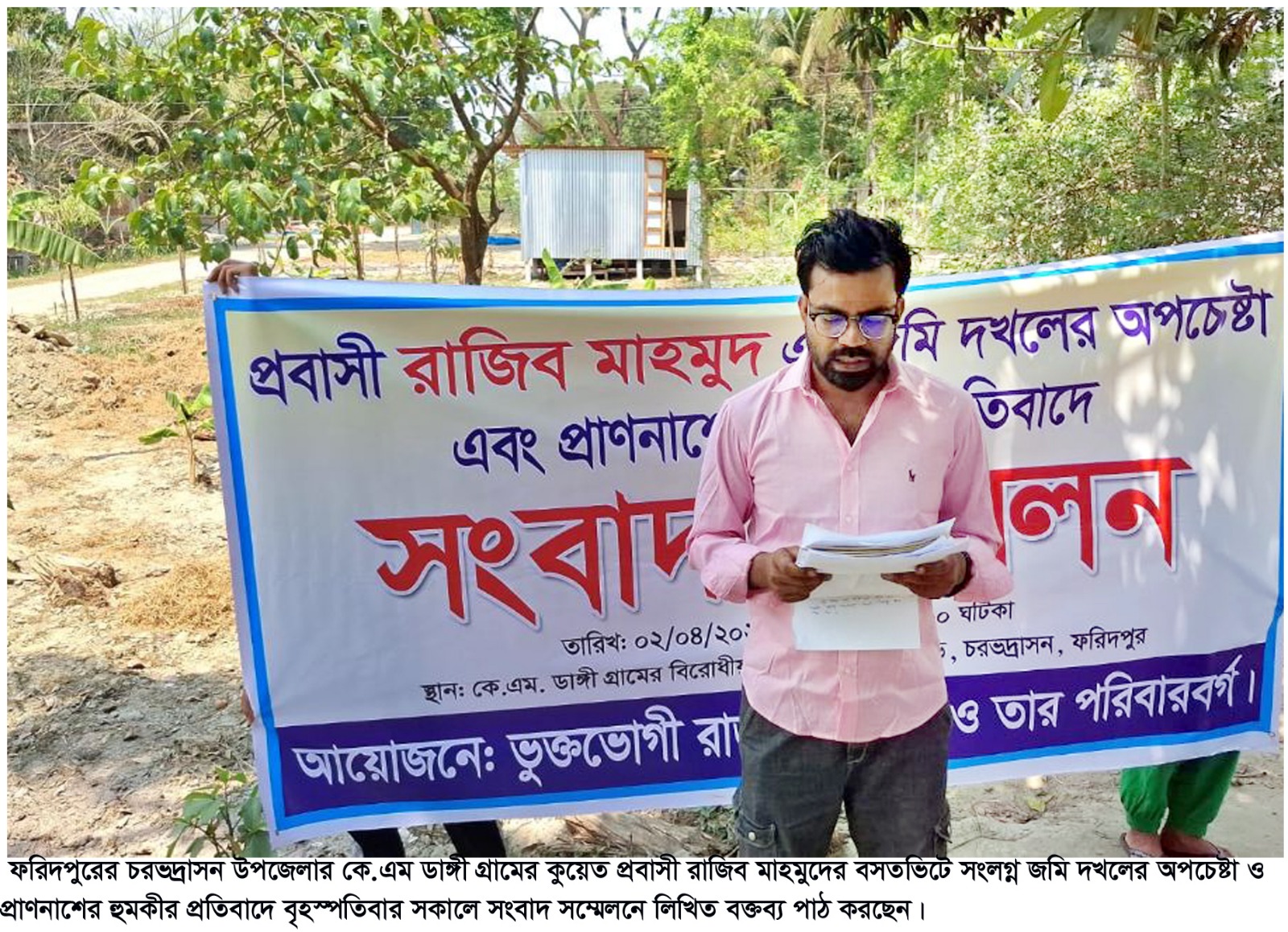 সংবাদ সম্মেলনে লিখিত বক্তব্য পাঠ করেন কুয়েত প্রবাসী রাজিব মাহমুদ। তিনি জানান, প্রবাস জীবনের অনেক কষ্টে অর্জিত অর্থ দিয়ে তার বসতভিটে সংলগ্ন প্রকৃত মালিকদের কাছ থেকে তিনি ১০.৩৯ শতাংশ জমি ক্রয় করেন। তার ক্রয়কৃত উক্ত ক্রয়কৃত জমির সাথে তার মা রেজিয়া বেগম তার পৈত্রিক ওয়ারিশ স্বত্তে প্রাপ্ত জমি মিলে তাদের ১৮ শতাংশ জমি রয়েছে। উক্ত জমিতে দীর্ঘদিন ধরে প্রবাসী রাজিব মাহমুদের দখলে রয়েছে এবং জমিতে প্রবাসীর বসতিয় ঘর দরজা, গাছপালা ও বৃক্ষরাজি সহ বাউন্ডারী ওয়াল রয়েছে। উক্ত জমি ক্রয়ের পর রাজিব মাহমুদ জমির নামপত্তন জারী (মিউটেশন) করেছেন এবং ভুমি উন্নয়ন কর পরিশোধ করে চলেছেন। উক্ত প্রবাসীর জমির নামপত্তন জারীর খতিয়ান নং হলো-২০০৫-১০০০০৭ নং। প্রবাসীর বসতিয় জমিটুকু দিয়ারা ২৬/১১ নং চরভদ্রাসন মৌজার ২৩৯ নং খতিয়ানের ৫১৪৪ নং, ৫১৪২ নং, ৫২২৭ নং ও ৫২২৯ নং দাগের অন্তর্ভুক্ত জমি।