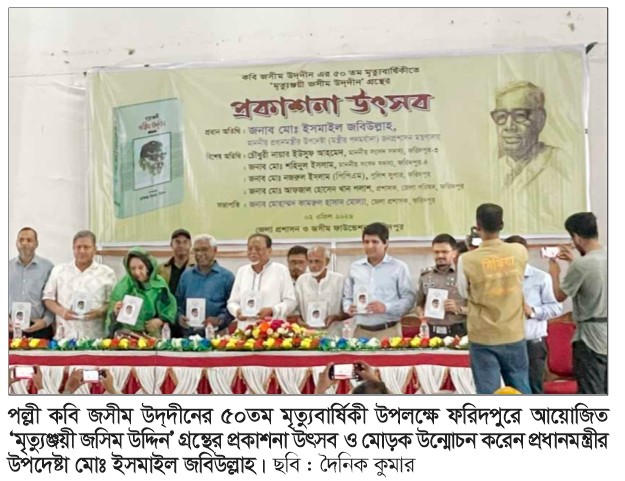 পল্লী কবি জসীম উদ্দীনের ৫০তম মৃত্যুবার্ষিকী উপলক্ষে ফরিদপুরে ‘মৃত্যুঞ্জয়ী জসিম উদ্দিন’ গ্রন্থের প্রকাশনা উৎসব ও মোড়ক উন্মোচন অনুষ্ঠিত হয়েছে। গত বৃহস্পতিবার বিকেলে জেলা শিশু একাডেমি মিলনায়তনে জেলা প্রশাসন ও জসিম ফাউন্ডেশনের যৌথ উদ্যোগে এই অনুষ্ঠানের আয়োজন করা হয়। ফরিদপুরের জেলা প্রশাসক মোহাম্মদ কামরুল হাসান মোল্যার সভাপতিত্বে অনুষ্ঠানে প্রধান অতিথি হিসেবে উপস্থিত ছিলেন প্রধানমন্ত্রীর উপদেষ্টা মোঃ ইসমাইল জবিউল্লাহ। বিশেষ অতিথি হিসেবে বক্তব্য রাখেন সংসদ সদস্য চৌধুরী নায়াব ইউসুফ, মোঃ শহিদুল ইসলাম বাবুল, পুলিশ সুপার মোঃ নজরুল ইসলাম, জেলা পরিষদ প্রশাসক আফজাল হোসেন খান পলাশ ও সিভিল সার্জন ডা. হাসান মাহমুদ। অনুষ্ঠানে বক্তারা কবির সাহিত্যকর্মে গ্রামীণ বাংলার ঐতিহ্য ও মানবিক মূল্যবোধের গুরুত্ব তুলে ধরেন। আলোচনা সভা শেষে একটি মনোজ্ঞ সাংস্কৃতিক অনুষ্ঠান এবং বিভিন্ন প্রতিযোগিতার বিজয়ীদের মাঝে পুরস্কার বিতরণের মধ্য দিয়ে আয়োজনটি সমাপ্ত হয়। অনুষ্ঠানে স্থানীয় সাহিত্যপ্রেমী ও বিভিন্ন শ্রেণি-পেশার সুধীজন উপস্থিত ছিলেন।