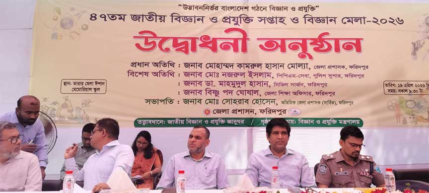 উদ্ভাবননির্ভর বাংলাদেশ গঠনের অঙ্গীকার নিয়ে ফরিদপুরে জাঁকজমকপূর্ণভাবে শুরু হয়েছে ৪৭তম জাতীয় বিজ্ঞান ও প্রযুক্তি সপ্তাহ ও বিজ্ঞান মেলা ২০২৬। ১৯ এপ্রিল রবিবার সকালে শহরের তারার মেলা ঈশান মেমোরিয়াল স্কুল মাঠে বর্ণাঢ্য অনুষ্ঠানের মাধ্যমে দুই দিনব্যাপী এই মেলার শুভ উদ্বোধন করা হয়। জেলা প্রশাসনের আয়োজনে এবং বিজ্ঞান ও প্রযুক্তি মন্ত্রণালয়ের পৃষ্ঠপোষকতায় জাতীয় বিজ্ঞান ও প্রযুক্তি জাদুঘরের তত্ত্বাবধানে এই কর্মসূচি বাস্তবায়িত হচ্ছে।