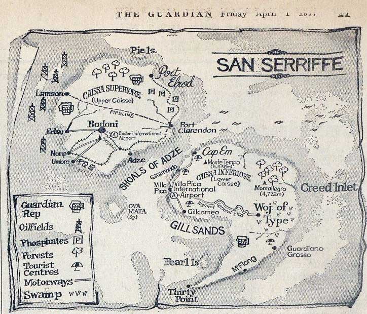 দ্য গার্ডিয়ানের সেই সাপ্লিমেন্টে সান সেরিফকে একটি ক্ষুদ্র দ্বীপপুঞ্জ হিসেবে দেখানো হয়েছিল, যা দেখতে অনেকটা সেমিকোলন (;) এর মতো। এর দুটি প্রধান দ্বীপ ছিল: