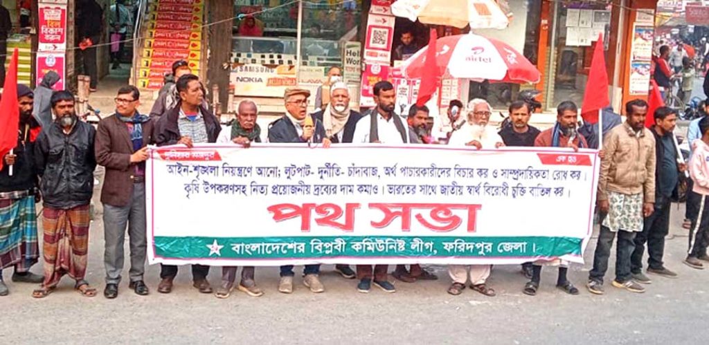 আইনশৃঙ্খলা নিয়ন্ত্রণ , লুটপাট দুর্নীতি, চাঁদাবাজ অর্থ পাচারকারীদের বিচার , সাম্প্রদায়িকতা রোধ, কৃষি উপকরন সহ নিত্য প্রয়োজনীয় দ্রব্যমূল্যের দাম কমানো ভারতের সাথে জাতীয় স্বার্থ বিরোধী চুক্তি বাতিলের দাবিতে উক্ত পথসভা অনুষ্ঠিত হয় । সংগঠনের সভাপতি আব্দুল কাদের আজাদ , এর সভাপতিত্বে এ সময় অনুষ্ঠানে বক্তব্য রাখেন কেন্দ্রীয় কমিটির প্রেসিডিয়াম সদস্য নজরুল ইসলাম , ফরিদপুর জেলা কমিটির সদস্য শহিদুল ইসলাম কেন্দ্রীয় কমিটির নেতা নজরুল ইসলাম, সাংবাদিক হাসানুজ্জামান বিপ্লবী কমিউনিস্ট লীগের কেন্দ্রীয় কমিটির সম্পাদক মন্ডলীর সদস্য কমরেড কাজী ফিরোজ প্রমূখ।