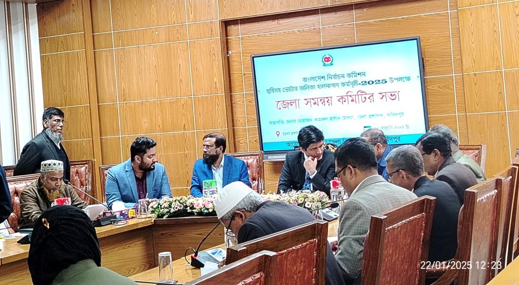 ফরিদপুর জেলা সমন্বয় কমিটির সভা অনুষ্ঠিত হয়েছে। বুধবার বেলা সাড়ে বারোটায় ফরিদপুর সিনিয়র জেলা নির্বাচন অফিসের আয়োজনে এসভা অনুষ্ঠিত হয় । ফরিদপুরের জেলা প্রশাসক মোহাম্মদ কামরুল হাসান মোল্যা সভাপতিত্বে বাংলাদেশ নির্বাচন কমিশন ছবিসহ ভোটার তালিকা হালনাগাদ কর্মসূচি-২০২৫ উপলক্ষে জেলা সমন্বয় কমিটির এ সভা জেলা প্রশাসকের সম্মেলন কক্ষে অনুষ্ঠিত হয়।