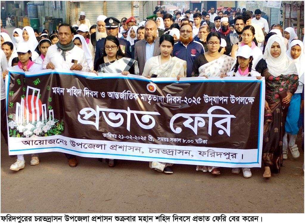 ফরিদপুরের চরভদ্রাসন উপজেলা প্রশাসনের উদ্যোগে শুক্রবার মহান শহীদ দিবস ও আন্তর্জাতিক মাতৃভাষা দিবস ২০২৫ খ্রিঃ পালিত হয়েছে। এ উপলক্ষে রাত ১২টা এক মিনিটে উপজেলা কেন্দ্রীয় শহীদ মিনারে পুস্প স্তবক অর্পন পর্ব সম্পন্ন করা হয়। এরপর সকাল ৮টায় এক বর্ণাঢ্য প্রভাত ফেরি বের করেন উপজেলা প্রশাসন । এ প্রভাত ফেরিটি উপজেলা সদর বাজার সহ বিভিন্ন সড়ক প্রদক্ষিন করেন। পরে উপজেলা হলরুমে এক আলোচনা সভা অনুষ্ঠিত হয়।এ আলোচনা সভার সভাপতিত্ব করেন উপজেলা নির্বাহী অফিসার মনিরা খাতুন।