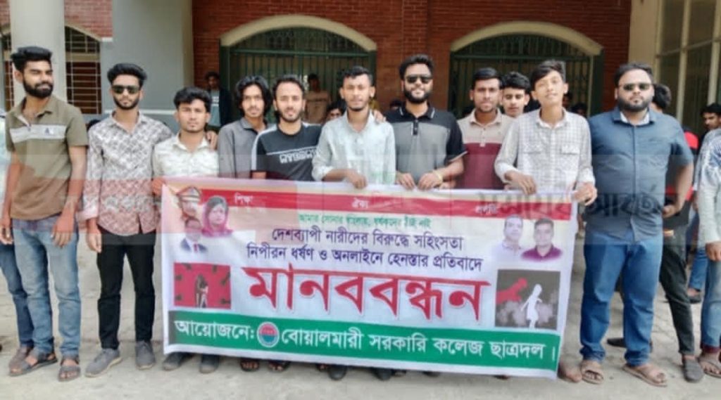 দেশজুড়ে নারীরা সহিংসতা নিপীড়ন ধর্ষণ ও বিভিন্ন মাধ্যমে এনেস্টার শিকার হওয়ায় প্রতিবাদে বিক্ষোভ মিছিল ও মানববন্ধন করেছে বোয়ালমারী সরকারি কলেজ ছাত্রদল সোমবার ১০ই মার্চ বেলা সাড়ে এগারোটার সরকারি কলেজ ছাত্রদলের আয়োজনে কলেজ ক্যাম্পাসে খুব মিছিল ও মানববন্ধন অনুষ্ঠিত হয় বিক্ষোভ কর্মসূচিতে নারী ও নিপীড়ন বন্ধে বিভিন্ন স্লোগান দেয় নেতাকর্মীরা। এসময় ছাত্র দলের নেতাকর্মীরা বলেন, সারাদেশে নারীদের উপর ধর্ষণ নিপীড়ন ক্রমাগত বেড়েই চলছে।