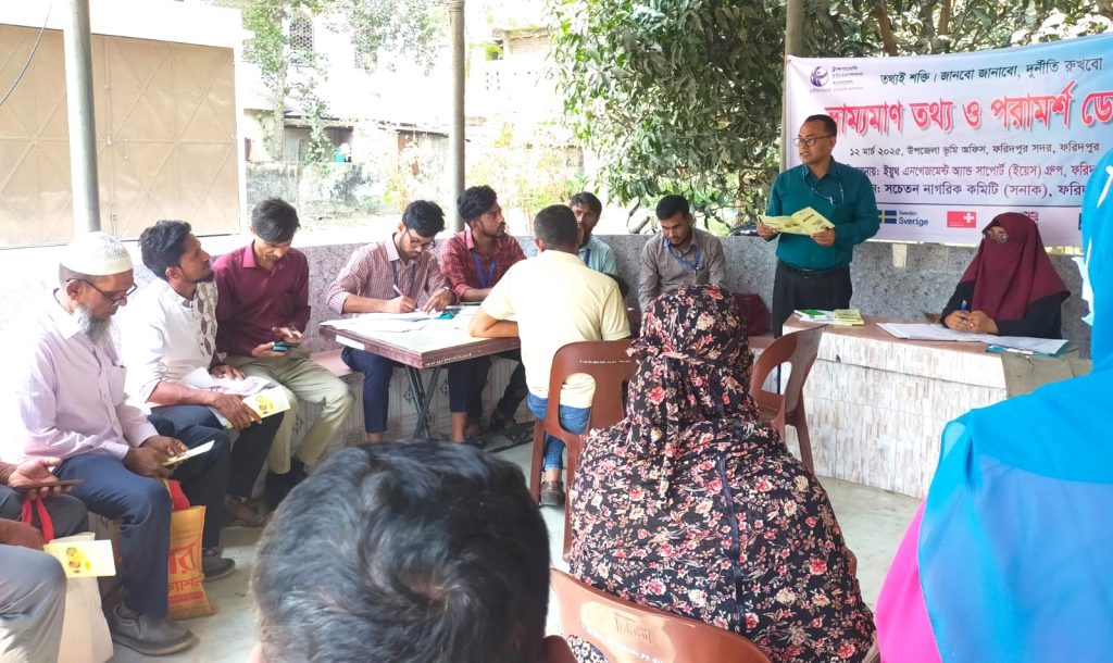 সুশাসন প্রতিষ্ঠায় তথ্য অধিকার আইন বাস্তবায়নের বিকল্প নেই এ লক্ষ্যকে সামনে রেখে ট্রান্সপারেন্সি ইন্টারন্যাশনাল বাংলাদেশ (টিআইবি)-এর উদ্যোগে গঠিত সচেতন নাগরিক কমিটি (সনাক), ফরিদপুরের ইয়ুথ এনগেজমেন্ট অ্যান্ড সার্পোট (ইয়েস) গ্রপ উপজেলা ভূমি অফিসে একটি ভ্রাম্যমান তথ্য ও পরামর্শ ডেস্ক পরিচালিত করে।