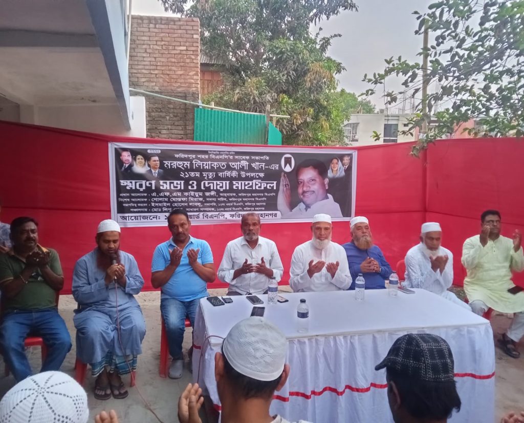 ফরিদপুর শহর বিএনপির সাবেক সভাপতি মরহুম লিয়াকত আলী খাঁনের ২১তম মৃত্যুবার্ষিকী উপলক্ষে আলোচনা সভা দোয়া মাহফিল অনুষ্ঠিত হয়েছে। গতকাল মঙ্গলবার শহরের লাক্সারি হোটেলের পাশে উক্ত অনুষ্ঠানের আয়োজন করা হয়। ১২ নং ওয়ার্ড বিএনপি’র সভাপতি মোহাম্মদ ইসমাইল হোসেন লাভলুর সভাপতিত্বে এবং সাধারণ সম্পাদক লিপু শেখের সঞ্চালনায় অনুষ্ঠানে প্রধান অতিথি হিসেবে উপস্থিত ছিলেন মহানগর বিএনপির আহ্বায়ক এ এফ.এম কাইয়ুম জঙ্গি,বিশেষ অতিথি উপস্থিত ছিলেন মহানগর বিএনপির সদস্য সচিব গোলাম মোস্তফা মিরাজ, জিয়া মঞ্চের আহ্বায়ক লিয়াকত হোসেন লাবলু, মহানগর বিএনপির যুগ্ম আহবায়ক অ্যাডভোকেট আলমগীর কবির, ৮ নং ওয়ার্ড বিএনপির সভাপতি হারুনুর রশিদ হারু খা, যুগ্ম আহবায়ক এম টি আক্তার টুটুল, মহানগর মহিলা বিএনপির সভাপতি রোকসানা পারভিন পাপিয়া, সাংগঠনিক সম্পাদক শিউলি আক্তার, সহ-সভাপতি পলি বেগম। অনুষ্ঠানে মরহুমের জীবন ও কর্ম তুলে ধরে আলোচনা করা হয়। এরপর মরহুমের রুহের মাগফেরাত কামনায় মোনাজাত করা হয়। বিএনপি ও তার অঙ্গ সংগঠনের নেতৃবৃন্দ উপস্থিত ছিলেন।