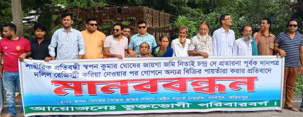 প্রতারণার মাধ্যমে প্রতিবন্ধীর জমি আত্মসাত, এলাকাবাসীর মানববন্ধন
