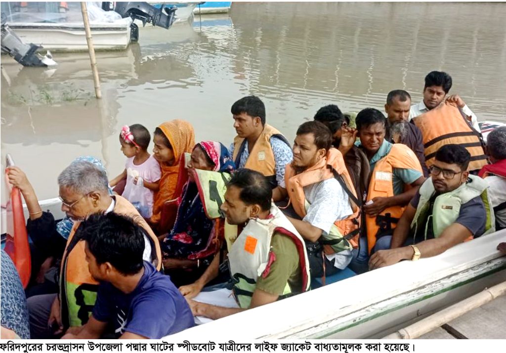 ফরিদপুরের চরভদ্রাসনের গোপালপুর ও মৈনট ঘাট দিয়ে প্রতিদিন হাজারো যাত্রী স্পিডবোটে পদ্মা নদী পারাপার করেন। শ্রাবণের উত্তাল পদ্মায় যাত্রী নিরাপত্তা নিশ্চিত করতে উপজেলা প্রশাসন স্পিডবোট যাত্রীদের জন্য লাইফ জ্যাকেট পরিধান বাধ্যতামূলক করেছে।