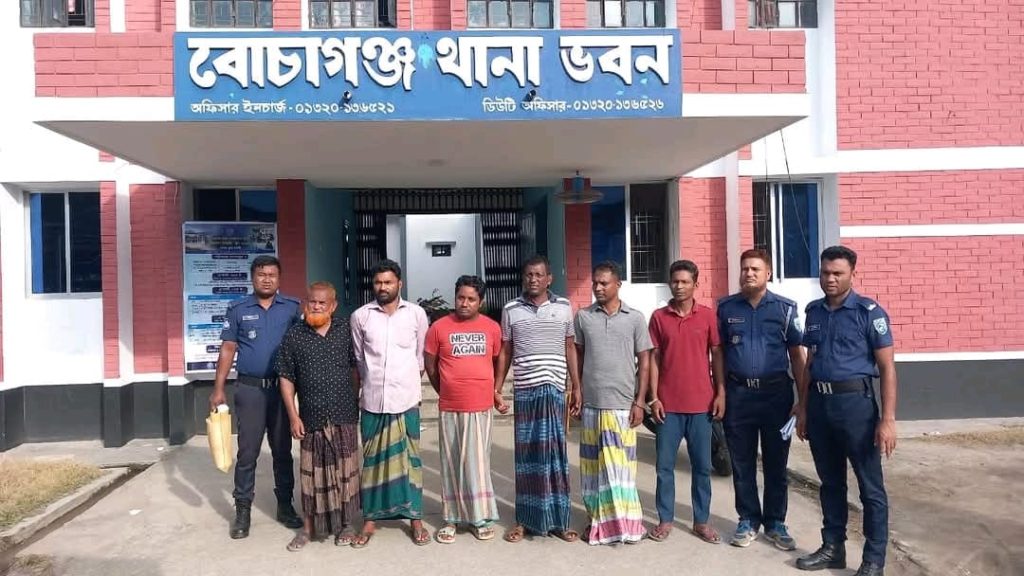 ঘটনাটি ঘটে ৬ জুলাই, রবিবার দিবাগত রাতে। অভিযান পরিচালনা করে বোচাগঞ্জ থানা পুলিশ। গ্রেফতারকৃত অন্যরা হলেন—সুকদেবপুর গ্রামের মৃত নেহাল উদ্দিনের পুত্র আফতাব উদ্দিন, চাঁপাইতোর মাঝাপাড়া গ্রামের আব্দুস সামাদের পুত্র লিটন পারভেজ, ভররা তালতলী গ্রামের মৃত মহির উদ্দিনের পুত্র রেজাউল ইসলাম রেজা, টেনা গ্রামের মৃত ইউসুফ আলীর পুত্র তোজামুল হক এবং চন্ডিপুর গ্রামের আব্দুল খালেকের পুত্র ফারুক হোসেন।