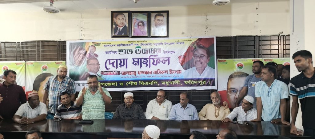ফরিদপুরের মধুখালীতে বাংলাদেশ জাতীয়তাবাদী দল (বিএনপি) মধুখালী উপজেলা শাখার কার্যালয়ের শুভ উদ্বোধন উপলক্ষে এক দোয়া মাহফিল অনুষ্ঠিত হয়েছে। বৃহস্পতিবার (৩ জুলাই) সন্ধ্যা ৭টায় ঢাকা-খুলনা মহাসড়কের মধুখালী বাজারসংলগ্ন জান্নাত আরা ম্যানশনের দ্বিতীয় তলায় এ দোয়া মাহফিল অনুষ্ঠিত হয়।