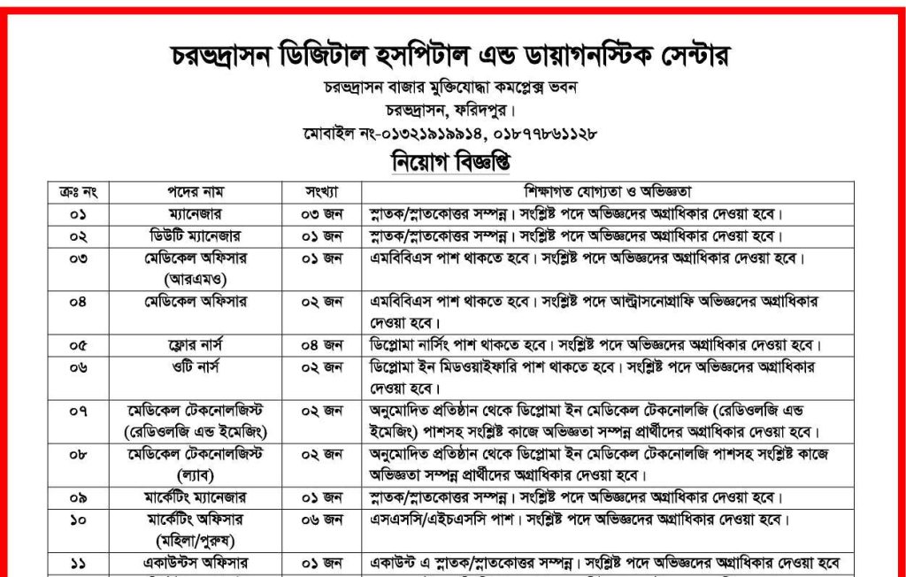 চরভদ্রাসন ডিজিটাল হসপিটাল এন্ড ডায়াগনস্টিক সেন্টারে ম্যানেজার, ডিউটি ম্যানেজার, মেডিকেল অফিসার (আরএমও), মেডিকেল অফিসার, ফ্লোর নার্স, ওটি নার্স, মেডিকেল টেকনোলজিস্ট (রেডিওলজি এন্ড ইমেজিং), মেডিকেল টেকনোলজিস্ট (ল্যাব), মার্কেটিং ম্যানেজার, মার্কেটিং অফিসার (মহিলা/পুরুষ), একাউন্টস অফিসার, কম্পিউটার অপারেটর (মহিলা/পুরুষ), রিসিপশনিষ্ট (মহিলা/পুরুষ), ফার্মাসিস্ট, ডাক্তার এটেনডেন্ট (মহিলা), গাড়ি চালক/এ্যাম্বুলেন্স ড্রাইভার, ইলেক্টিশিয়ান, ওয়ার্ড বয় অথবা ওয়ার্ড আয়া এবং নিরাপত্তা প্রহরী নিয়োগ করা হবে।