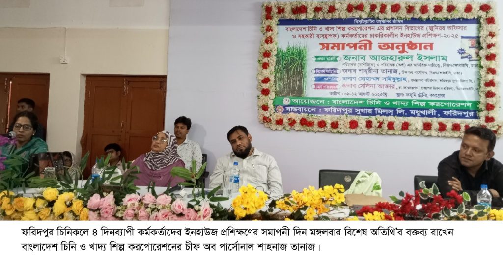 ফরিদপুর চিনিকলে কর্মকর্তাদের চারদিন ব্যাপী চাকুরিকালীন ইনহাউজ প্রশিক্ষণ সমাপ্ত