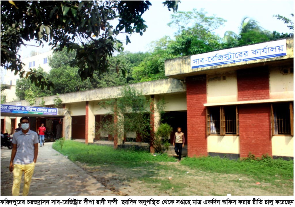 ফরিদপুরের চরভদ্রাসন উপজেলা সাব-রেজিষ্ট্রার দীপা রানী নন্দী প্রায় দুই বছর ধরে সপ্তাহে মাত্র একদিন অফিসে উপস্থিত হয়ে সমস্ত দাপ্তরিক কার্যাবলী সম্পন্ন করে চলেছেন। সম্প্রতী তিনি প্রতি বৃহস্পতিবার রাজধানী ঢাকার বাসা থেকে উপজেলা সাব-রেজিষ্ট্রার কার্যালয়ে হাজির হয়ে মাত্র একদিনে সারা সপ্তাহের অফিসিয়াল পেন্ডিং কাজ সম্পন্ন করে আবার ঢাকায় ফিরে থাকেন। এতে উপজেলার কৃষক শ্রমিক মজুর ও সাধারন পরিবারগুলো সপ্তাহে মাত্র একদিন জমির দলিল রেজিষ্ট্রি করতে গিয়ে অতিরিক্ত চাপে পড়ছেন। ফলে সারা সপ্তাহে জমাকৃত দলিল একদিন সম্পাদনের ভীরে সাধারনরা নির্ধারিত ফিসের অতিরিক্ত মোটা অংক ব্যায় করে করতে বাধ্য হচ্ছেন বলে অভিযোগ রয়েছে।