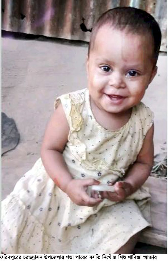 ফরিদপুরের চরভদ্রাসন উপজেলা সদর ইউনিয়নের হাজীডাঙ্গী গ্রামে পদ্মা পারে বসতি শাকিল শিকদারের দেড় বছরের কন্যা শিশু খাদিজা আক্তার গত রবিবার দুপুর থেকে নিখোঁজ হওয়ার পর আর খুজে পাওয়া যায়নি। শিশুটি বাড়ীর উঠানে খেলারত অবস্থায় নিখোঁজ হয়। নিখোঁজের পর এলাকাবাসীর ধারনা পদ্মা পারে পানিতে ডুবে শিশুটি মারা গিয়েছে। তাই ফায়ার সার্ভিস, ডুবরী দল ও স্থানীয়রা ট্রলারযোগে পদ্মা নদী তল্লাশি অভিযান চালিে ছেন। কিন্তু শিশুটির কানো সন্ধান করতে পারেনি।
