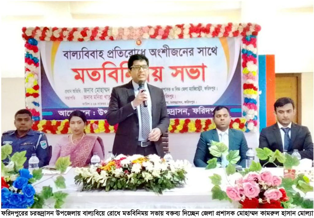 ফরিদপুরের চরভদ্রাসন উপজেলা পরিষদের মাল্টিপারপাস হলরুমে সোমবার দুপুরে বাল্যবিয়ে রোধে এক মতবিনিমিয় সভা অনুষ্ঠিত হয়েছে। সভায় প্রধান অতিথি হিসেবে উপস্থিত ছিলেন ফরিদপুর জেলা প্রশাসক মোহাম্মদ কামরুল হাসান মোল্যা। এ মতবিনিময় সভার সভাপতিত্ব করেন উপজেলা নির্বাহী অফিসার মনিরা খাতুন।