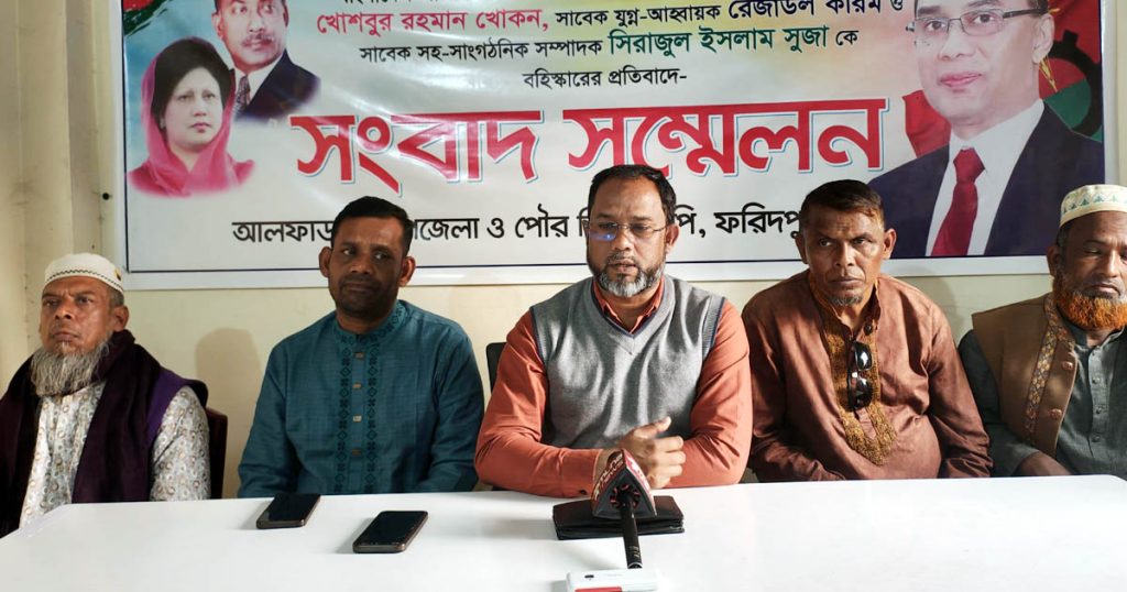 সংবাদ সন্মেলনে উপজেলা বিএনপির সাবেক সাংগঠনিক সম্পাদক ও বহিস্কৃত পৌর বিএনপির সহসভাপতি খুশবুর রহমান খোকন বলেন, আলফাডাঙ্গায় আওয়ামী লীগের পদধারী নেতাদের দিয়ে বিএনপির কমিটি গঠনের প্রতিবাদ করার কারনে আমাদের কোন প্রকার শোকজ ছাড়াই জেলার আহবায়ক ও সদস্য সচিব সাক্ষরিত এক বিজ্ঞপ্তির মাধ্যমে বহিস্কার করা হয়েছে।