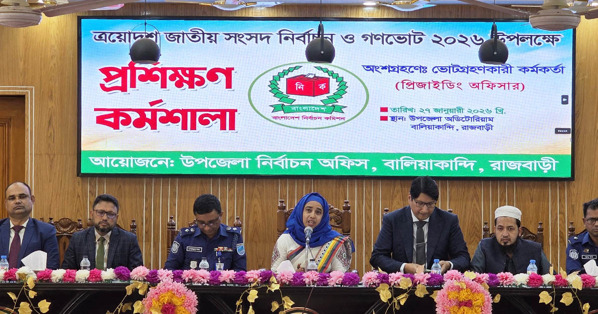 আসন্ন দ্বাদশ জাতীয় সংসদ নির্বাচনকে সামনে রেখে ভোটগ্রহণ কার্যক্রম আরও স্বচ্ছ, নিরপেক্ষ ও গ্রহণযোগ্য করতে রাজবাড়ীর বালিয়াকান্দি উপজেলায় প্রিসাইডিং ও সহকারী প্রিসাইডিং অফিসারদের অংশগ্রহণে এক প্রশিক্ষণ কর্মশালা অনুষ্ঠিত হয়েছে।