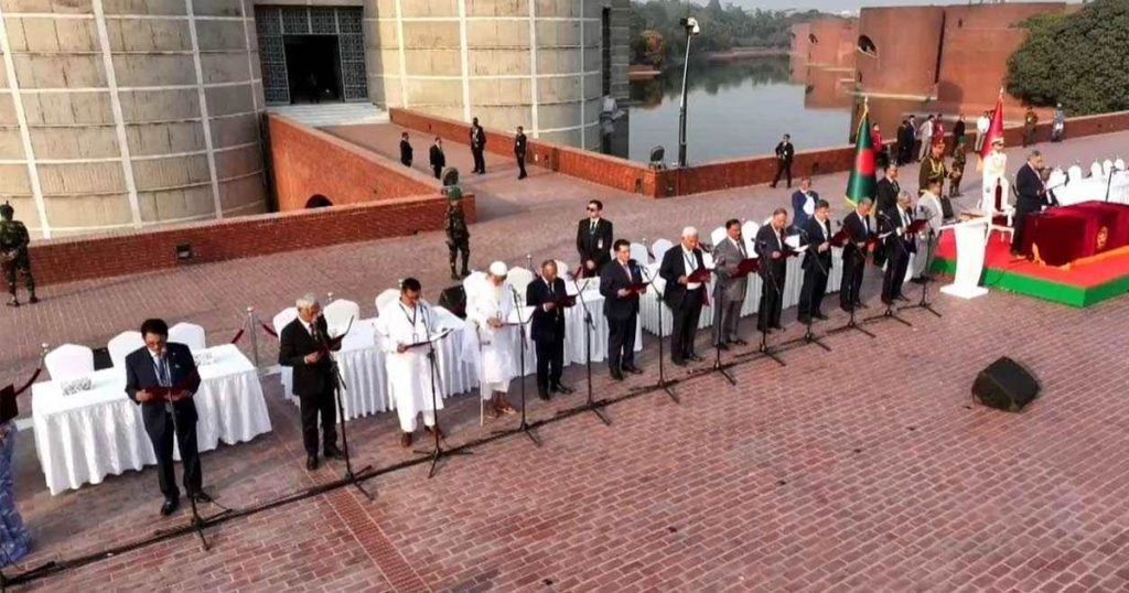 দীর্ঘ ১৮ মাসের প্রতীক্ষা আর সংস্কারের পথ বেয়ে আজ এক ঐতিহাসিক মাহেন্দ্রক্ষণের সাক্ষী হলো বাংলাদেশ। ত্রয়োদশ জাতীয় সংসদ নির্বাচনে নিরঙ্কুশ জয়ের পর আজ বিকেলে জাতীয় সংসদ ভবনের দক্ষিণ প্লাজায় শপথ নিয়েছে তারেক রহমানের নেতৃত্বাধীন নতুন মন্ত্রিসভা। রাষ্ট্রপতি মো. সাহাবুদ্দিন ২৫ জন পূর্ণমন্ত্রীকে শপথ বাক্য পাঠ করান।