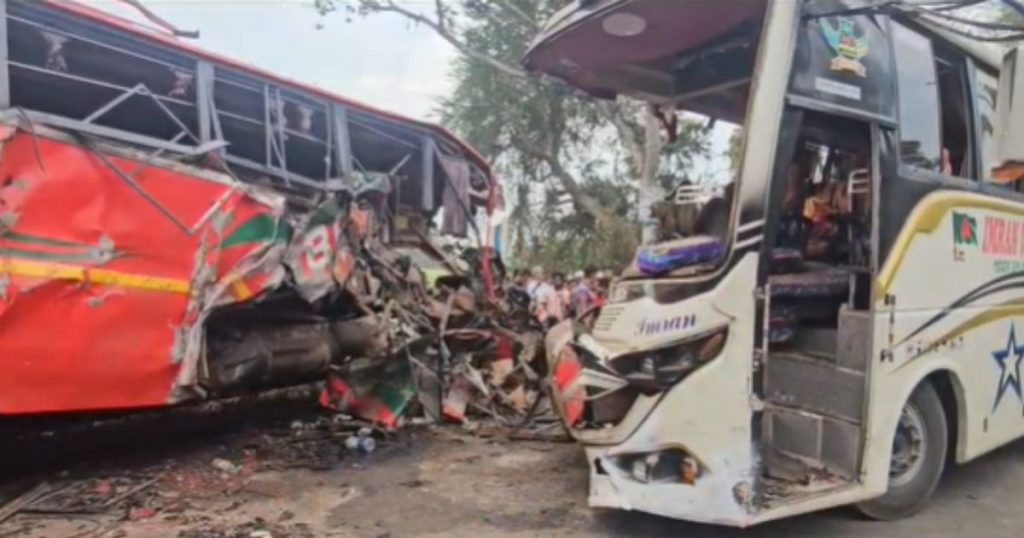 প্রত্যক্ষদর্শী ও পুলিশ সূত্রে জানা গেছে, ঢাকা থেকে বরিশাল অভিমুখে ছেড়ে আসা ইমরান পরিবহনের একটি বাসের সামনের চাকা আচমকা ফেটে যায়। চালক নিয়ন্ত্রণ হারালে বাসটি বিপরীত দিক থেকে আসা দ্রুতগামী একটি বিআরটিসি বাসের সাথে সরাসরি সংঘর্ষে লিপ্ত হয়। এসময় একটি ব্যাটারিচালিত ভ্যানও এই ত্রিমুখী দুর্ঘটনার কবলে পড়ে।