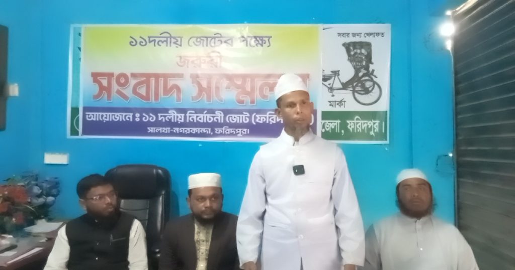 সংবাদ সম্মেলনে ১১ দলীয় জোটের পক্ষ থেকে সালথা উপজেলা জামায়াতের সেক্রেটারি মো. তরিকুল ইসলাম বলেন, ফরিদপুর-২ আসনের ১১ দলীয় জোট মনোনীত প্রার্থী আল্লামা আকরাম আলী হুজুরের পক্ষে ভোট চাওয়ায় আমাদের একজন কর্মীকে হুমকি দেওয়া হয়েছে এবং তাকে চাকরিচ্যুত করা হয়েছে। আমরা ১১ দলের পক্ষ থেকে এই ন্যাক্কারজনক ঘটনার তীব্র নিন্দা ও প্রতিবাদ জানাই। তিনি আরও জানান, সালথা ও নগরকান্দায় সুষ্ঠু নির্বাচনের পরিবেশ নেই। নেতাকর্মীদের বিভিন্ন স্থানে হুমকি-ধামকি দেওয়া হচ্ছে।
