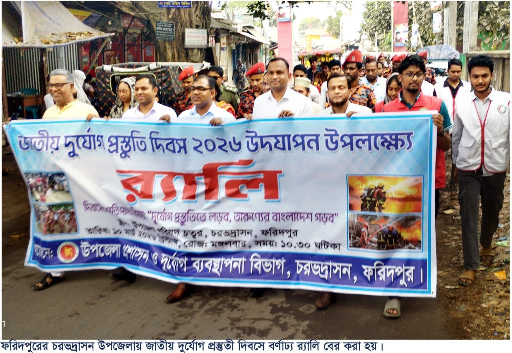 ফরিদপুরের চরভদ্রাসন উপজেলা প্রশাসন ও দুর্যোগ ব্যাবস্থাপনা বিভাগের উদ্যোগে মঙ্গলবার জাতীয় দুর্যোগ প্রস্তুতি দিবস-২০২৬খ্রি. পালন করা হয়েছে। এ উপলক্ষে সকাল ১১ টায় উপজেলা পরিষদ থেকে এক বর্ণাঢ্য র‌্যালি বের করা হয়। র‌্যালিটি প্রধান সড়কগুলো প্রদক্ষিনের পর উপজেলা পরিষদ চত্তরের সামনে অগ্নি নির্বাপক ও উদ্ধার মহড়া প্রদর্শন করেন ফায়ার সার্ভিস দল। পরে উপজেলা মিনি কনফারেন্স রুমে এক আলোচনা সভা অনুষ্ঠিত হয়।