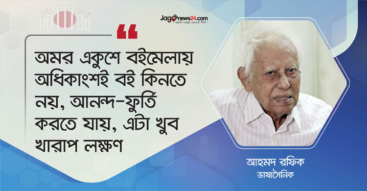 ভাষাসৈনিক আহমদ রফিক ‘অমর একুশে বইমেলায় অধিকাংশই বই কিনতে নয়, আনন্দ-ফুর্তি করতে যায়, এটা খুব খারাপ লক্ষণ। জাতির অবক্ষয়ের লক্ষণ। শিক্ষণীয় জায়গা থেকে শিক্ষা নিচ্ছি না, এটা ভালো লক্ষণ না।’…