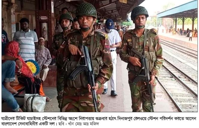 নিজস্ব প্রতিবেদক, দিনাজপুর শুক্রবার দিনাজপুর রেলওয়ে স্টেশনে হঠাৎ করে পরিদর্শনে আসেন বাংলাদেশ সেনাবাহিনীর একটি টিম। তারা যাত্রীদের টিকিট যাচাইসহ স্টেশনের বিভিন্ন অংশে নিরাপত্তা কার্যক্রম পরিচালনা করেন। এই অভিযানে ট্রেনযাত্রীদের মধ্যে…