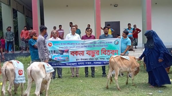 ফরিদপুরের সালথায় ২০২৪-২৫ অর্থ বছরে দেশীয় প্রজাতির মাছ এবং শামুক সংরক্ষণ ও উন্নয়ন প্রকল্প (১ম সংশোধিত) এর আওতায় ২য় ধাপে নিবন্ধিত সুফলভোগী জেলেদের মাঝে বিকল্প কর্মসংস্থান সৃষ্টির লক্ষ্যে উপকরণ হিসেবে বকনা বাছুর বিতরণ করা হয়েছে।