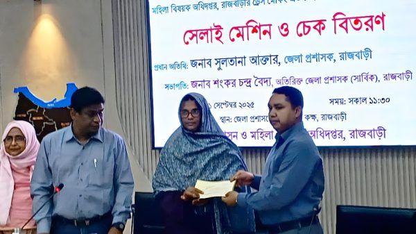 রাজবাড়ীতে মহিলা বিষয়ক অধিদপ্তরের আয়োজনে প্রশিক্ষণার্থীদের মাঝে সেলাই মেশিন এবং দুস্থ মহিলা ও শিশুদের মাঝে চেক বিতরণ করা হয়েছে।