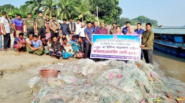 নদী ও সমুদ্রে মা ইলিশ রক্ষায় সরকারি ২২ দিনের নিষেধাজ্ঞার ১২তম দিন আজ বুধবার (১৫ অক্টোবর) ভোর ৪টা থেকে ৮টা পর্যন্ত পদ্মা নদীতে যৌথ অভিযান পরিচালনা করে উপজেলা প্রশাসন ও মৎস্য বিভাগ। এ সময় তাদের উপস্থিতি টের পেয়ে জাল রেখে অনেক জেলে পালিয়ে গেলেও ২২ জনকে আটক করে সাজা দেওয়া হয়। জব্দ করা ২০ কেজি মাছ স্থানীয় পূর্ব শ্যামপুর মাদরাসা ও দশ হাজার মাদরাসায় বিতরণ এবং ৫০ হাজার মিটার জাল নদীর পাড়ে আগুনে পুড়িয়ে ধ্বংস করা হয়েছে।