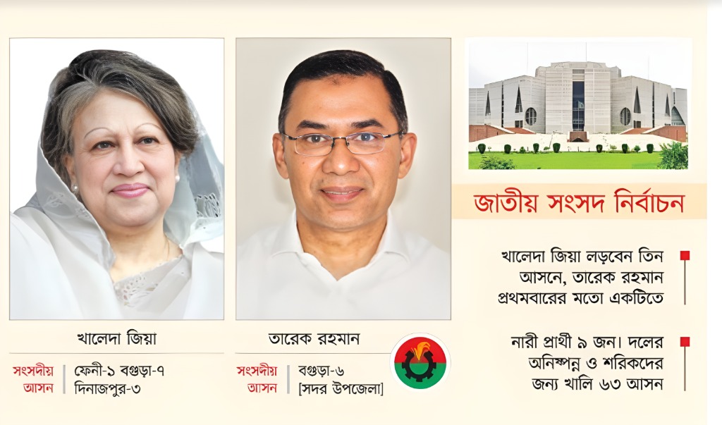 আগামী ত্রয়োদশ জাতীয় সংসদ নির্বাচনে ২৩৭ আসনে প্রার্থী ঘোষণা করেছে বিএনপি। দলের চেয়ারপারসন বেগম খালেদা জিয়া ফেনী-০১, বগুড়া-০৭ ও দিনাজপুর-০৩ আসন থেকে প্রার্থী হচ্ছেন। আর বিএনপির ভারপ্রাপ্ত চেয়ারম্যান তারেক রহমান প্রথম বারের মত নির্বাচন করবেন বগুড়া-৬ আসনে। বিএনপি মহাসচিব মির্জা ফখরুল ইসলাম আলমগীর প্রতিদ্বন্দ্বিতা করবেন ঠাকুরগাঁও-০১ আসনে।